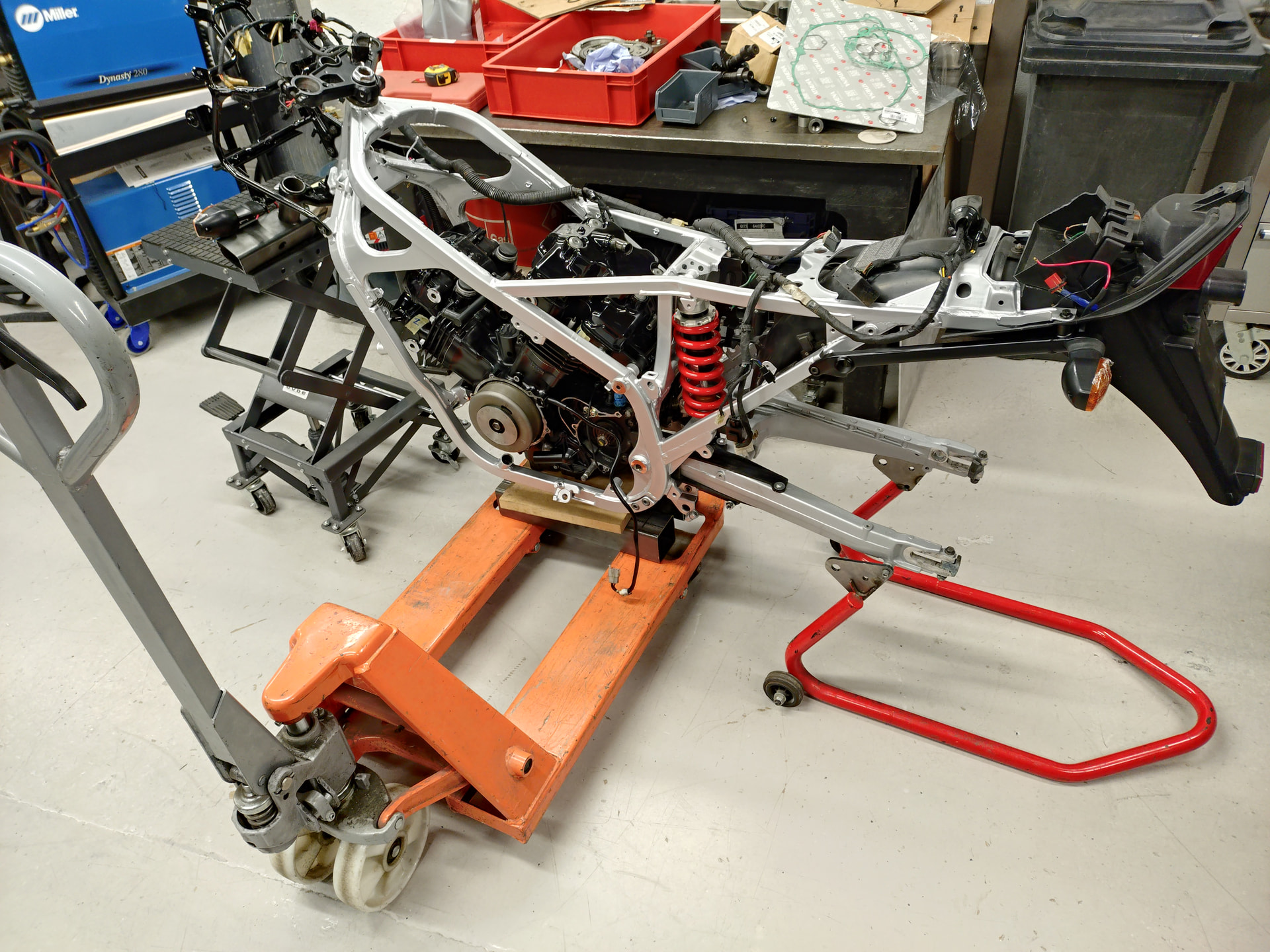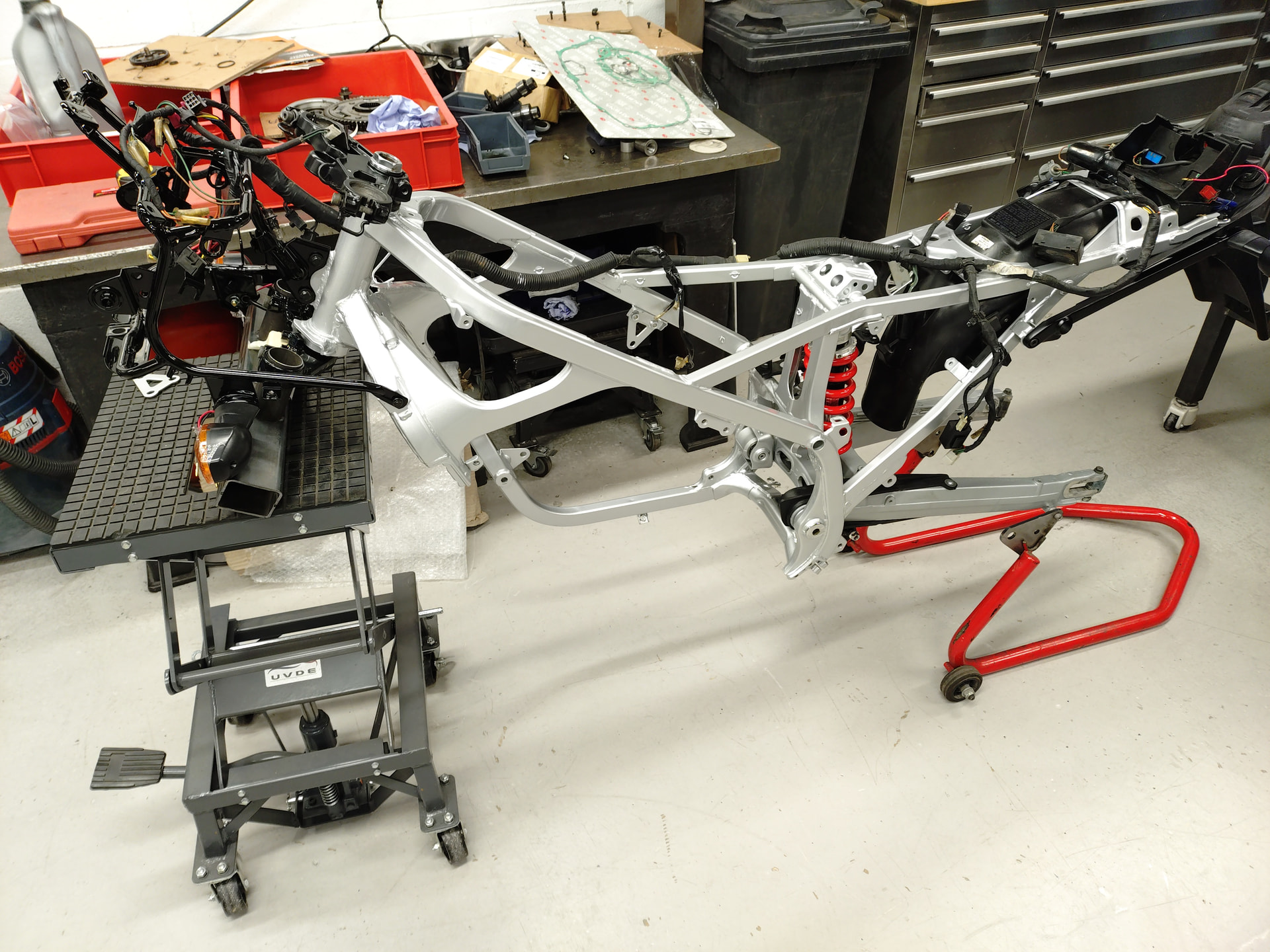 I welded some M8 bushes onto the underside of the swingarm before i blasted & painted it so i can use my rear paddock stand & made a piece to fit into the bottom yoke which i can use my jack/stand under to support it whilst i fit the motor, as recommended on here I’ve removed the clutch & getting it back in was way easier than getting it out :