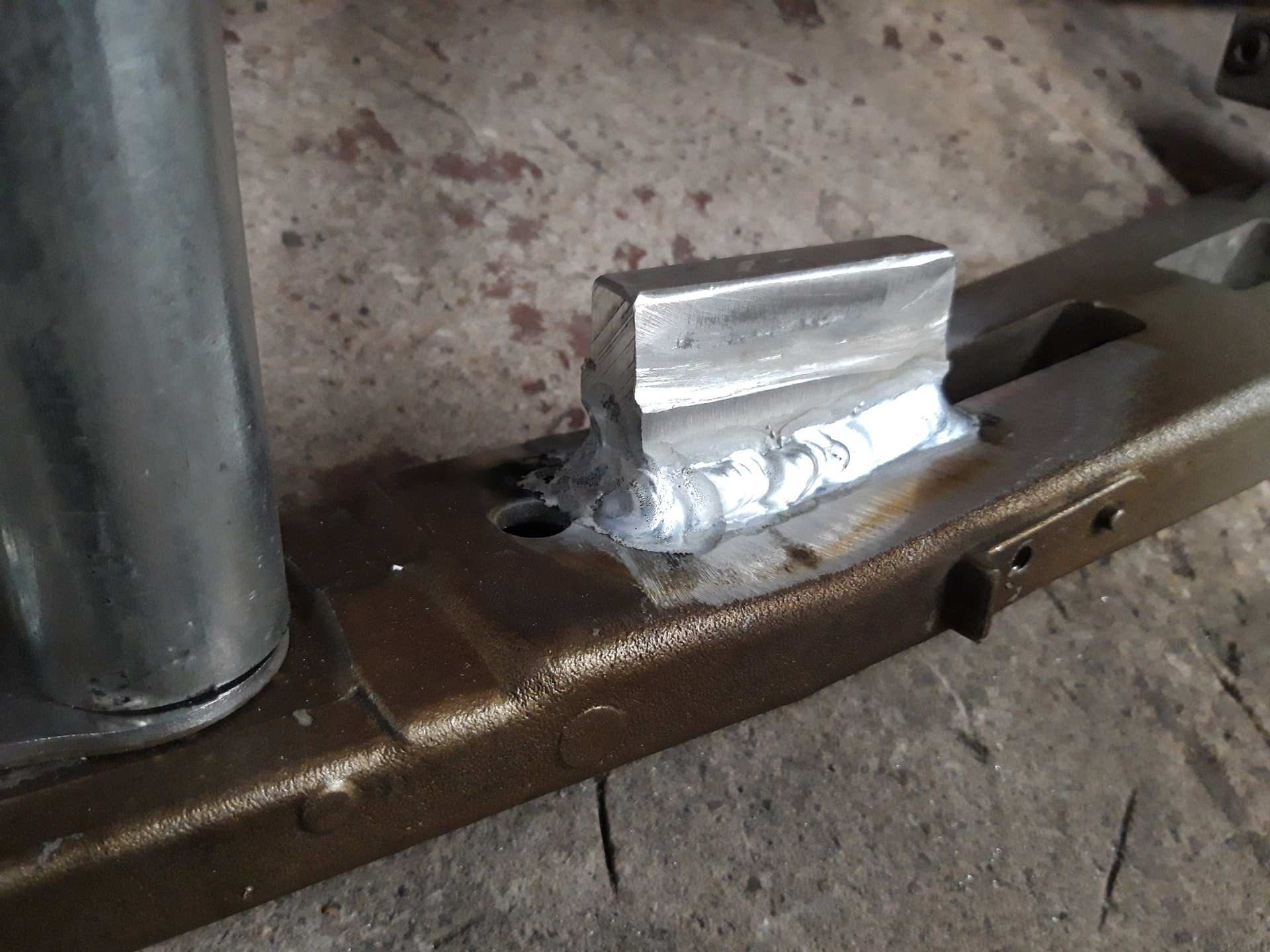 I’ve gone with the cbr600f4i rear caliper bracket, I shaped a aluminum lug to fit into the slot on the swingarm, it took a bit of fiddling to get i right, once that was done I tig welded it into the slot, my first attempt of tig welding, strong but not pretty