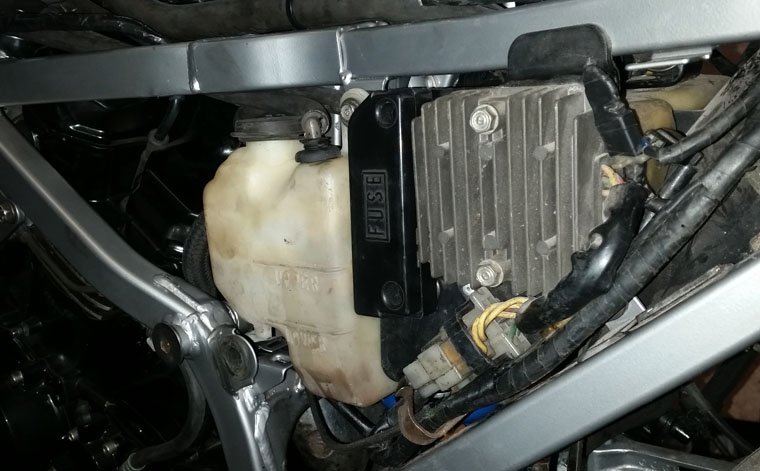 CBR600F fuse box, extended the original lead, just fits in between the FE coolant bottle and the FF regulator.