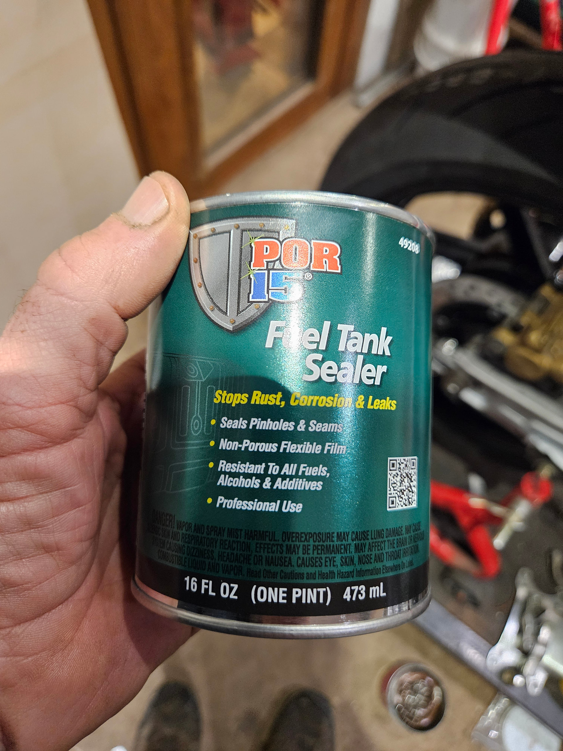 There’s only 280ml of liner in a por15 tin, thats just enough to coat a vf1000 tank, pour it in with the tank tipping slight forward and to the right, manoeuvre the tank onto its right side, backwards and forwards, then onto its top, then the base, you need to use as much of the liquid up befor doing the left side where the reserve gauze filter is..
